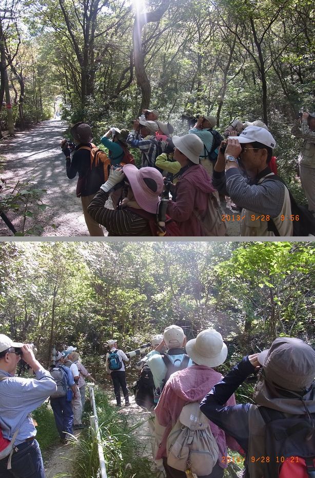 - 秋の渡り鳥を期待しての探鳥会、山道に入る前の林でサンコウチョウ・オオルリが、カラの混群と一緒に出て幸先よくスタートしました。