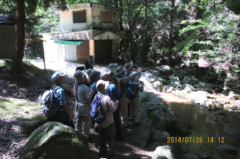 - 総じて鳥は少なかったが、帰りに管理道の頭上を通る送電線にツバメ60羽の群れ、そしてコース最終「月の輪滝」下流で鳥から清掃探鳥会参加者へのおもてなし、全員がオオルリを観察することができました。