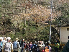 - 山地への登り口、月の輪滝での休憩は、ヤマザクラの下で(撮影:平さん)