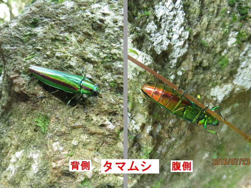- 今はタマムシの季節、背中はよく見ますが、裏返って歩いてくれました(撮影:平さん)