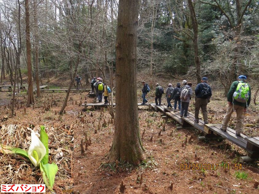 - ラクウショウの気根の林に、ミズバショウも