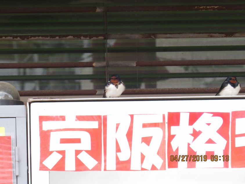 私市駅前の商店前に設置された格安切符自動販売機の上のツバメです。すぐ上に巣がありますが、まだ座っていませんでした