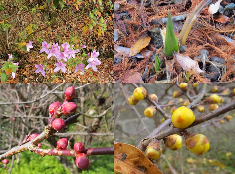 ⑦12月が暖かく春の花が咲き始めていた、モチツツジ、ミズバショウ、紅梅、ロウバイ