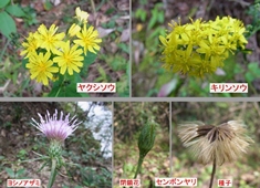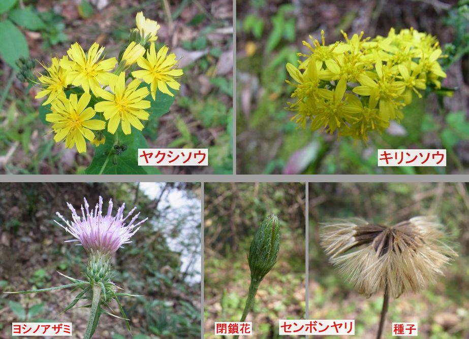 - C秋の山の花@ヤクシソウ、Aキリンソウ、Bヨシノアザミ、Cセンボンヤリ センボンヤリは閉鎖花が群生しており、閉鎖花と蕚(総苞片)が開いて種子が飛び 始めている状態で観察できました。 (閉鎖花=つぼみ状態のままで自家受粉し種子を作る仕組み。スミレが有名) 以上です。 (報告:平)