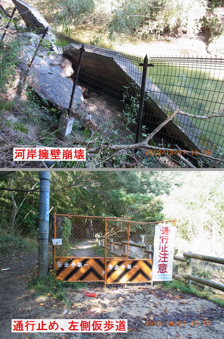 - @ハイキング道の河岸擁壁が崩壊、山側(私有地側)に仮歩道が設置されている。