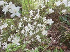 - 星のブランコから見える新緑の林床では、直径約2pほどの小さく白いツツジの花、シロバナウンゼンツツジ(白花雲仙躑躅)がひっそりと、しかし満開の見ごろを迎えていた。