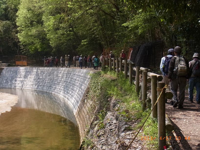 - 昨年8月の洪水で天野川沿い遊歩道に崖崩れが発生し通行止め、10月から山側に仮歩道が作られて通行できたが、補修工事がようやく終了しており、川沿いを歩くことができた。