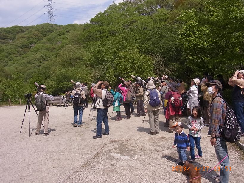 - ほしだ園地管理事務所(ピトンの小屋)前のハヤブサが営巣している磐場「哮ヶ峰」で、ハヤブサ♂♀の餌渡しを見るバードウォッチャー+カメラマン。