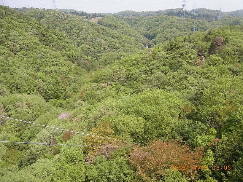 - ほしだ園地シンボルの吊り橋「星のブランコ」からの眺望、例年、萌黄の色の変化を楽しんでいたが、今年は芽吹きが早かったため、新緑の中にカスミザクラが点々としていた。(やや赤くまたは白く見えるのはカスミザクラ、ヤマザクラやソメイヨシノより2〜3週間遅く咲くサクラ。)