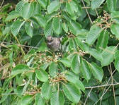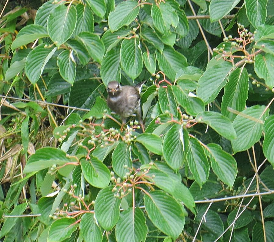 - 最近見つかったカラスによるクマノミズキの枝落としは確認できなかったが、ムクドリの群れがクマノミズキで採餌していました(撮影:平さん)