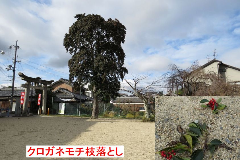 - 私市集落「若宮境内」でカラスによるクロガネモチの枝落とし(以降全て平さん撮影)
