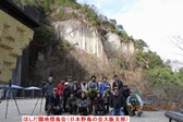 - ピトン小屋前で全員集合 右側:ハヤブサが営巣する岸壁「哮ヶ峰」 左側:人工岸壁「クライミングウオール」