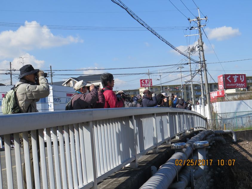 - 尚、鳥インフルエンザが拡大し、飼い鳥だけでなく野鳥に影響が出ていること、しかも淀競馬場でコブハクチョウが死亡していることから、淀川水系のカモはウィルス保菌者と思われるので、カモ観察のあとは靴などを消毒をした方が良いことや、養鶏所のある所へ行かないなど、鳥インフルエンザ対策が必要であることを参加者に説明し、納得してもらった。