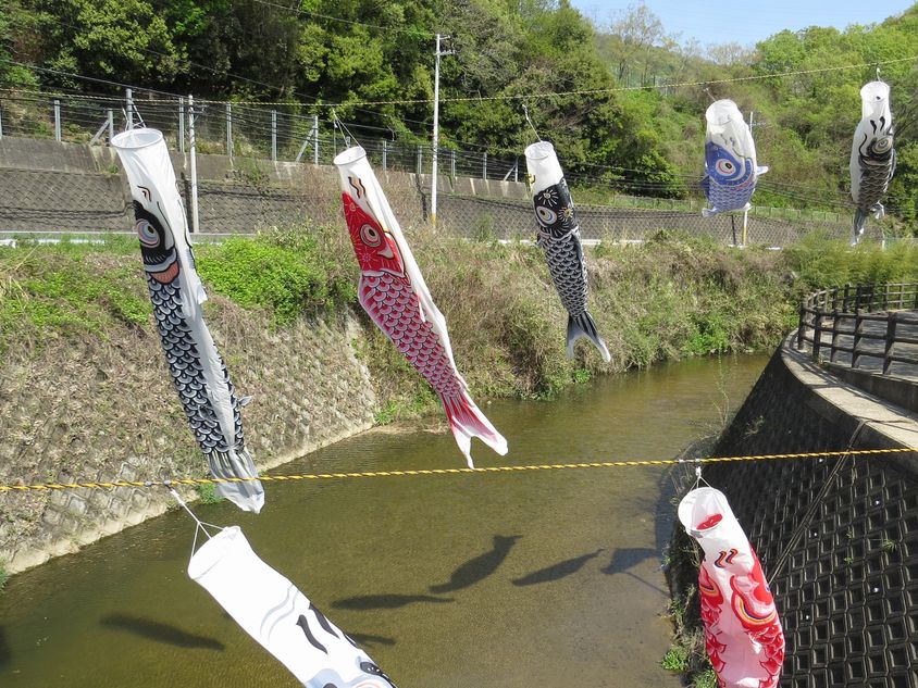 天野川にかかった鯉のぼりの影が水中を泳いでいた