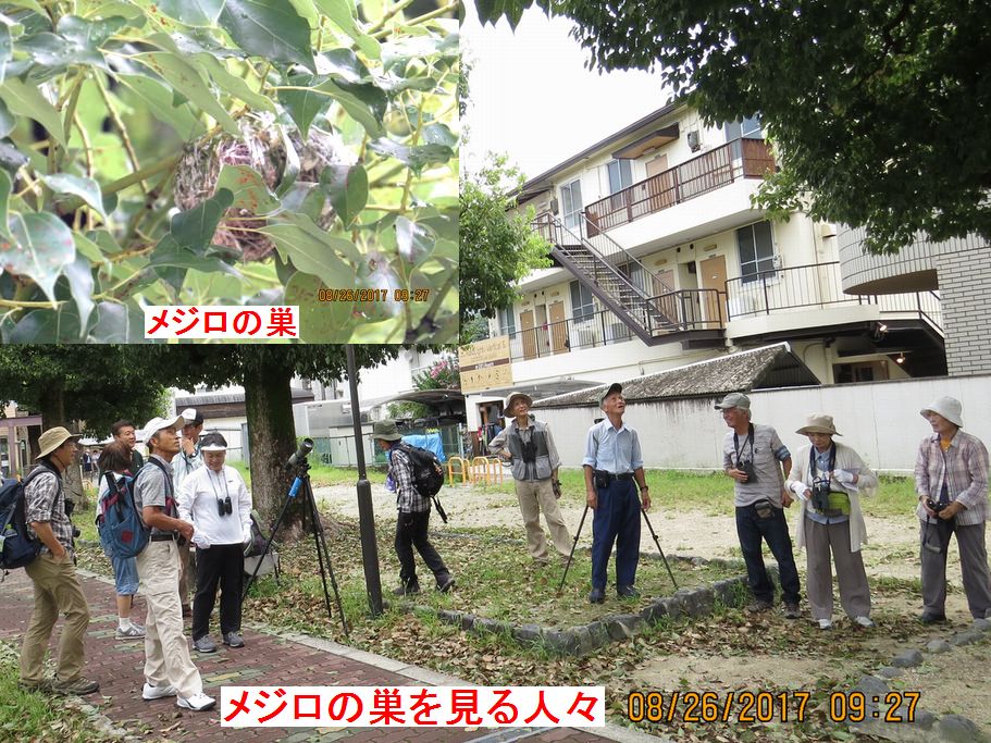 メジロの巣が定例会集合場所の頭上のクスノキにあり、ハッピーにスタート