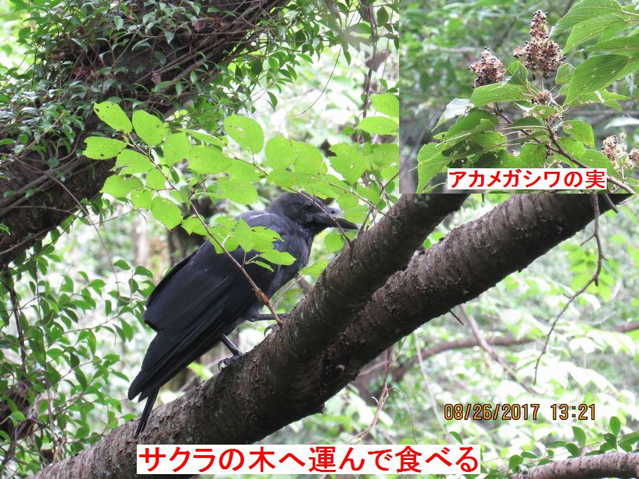 この季節、カラスによるアカメガシワの枝落としが観察されるが、今日はアカメガシワにいたのをバードウォッチャーに見られたため、アカメガシワの枝をくわえて移動し、近くのサクラの木の上で食べていました