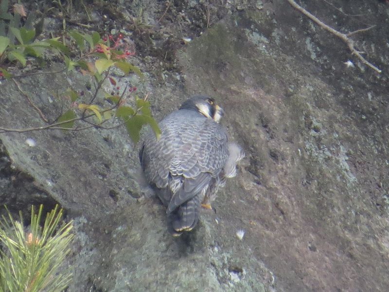 ほしだ園地のハヤブサ、行きにはピトンの小屋手前で、レース鳩を捕まえて飛来するのを一部の方が観察、帰りは岸壁に隠れるように休んでいるところを全員で観察するなど、堪能することができた。