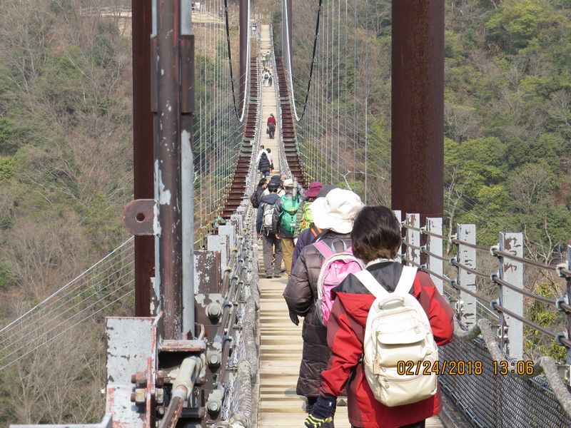 山々ではコバノミツバツツジの赤紫色、ヤマザクラの薄いピンク色、ウワミズザクラ・シロバナウンゼンツツジの白色などの花々が咲き乱れ、360度眺望の交野吊橋「星のブランコ」からは、さまざまな色に変化したパッチワーク模様の萌黄色を楽しんだ。