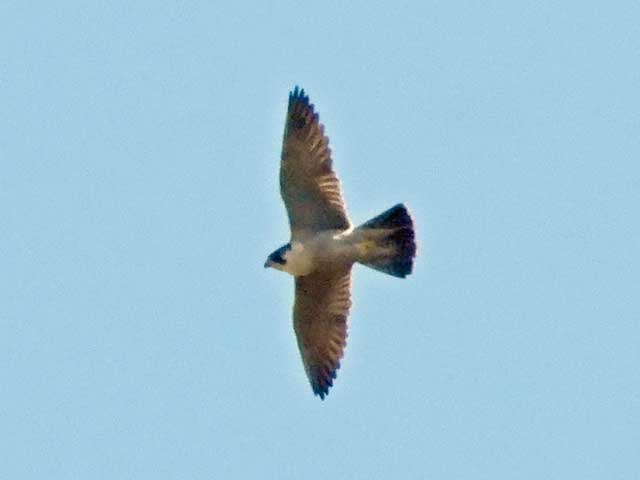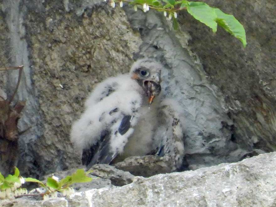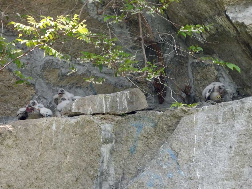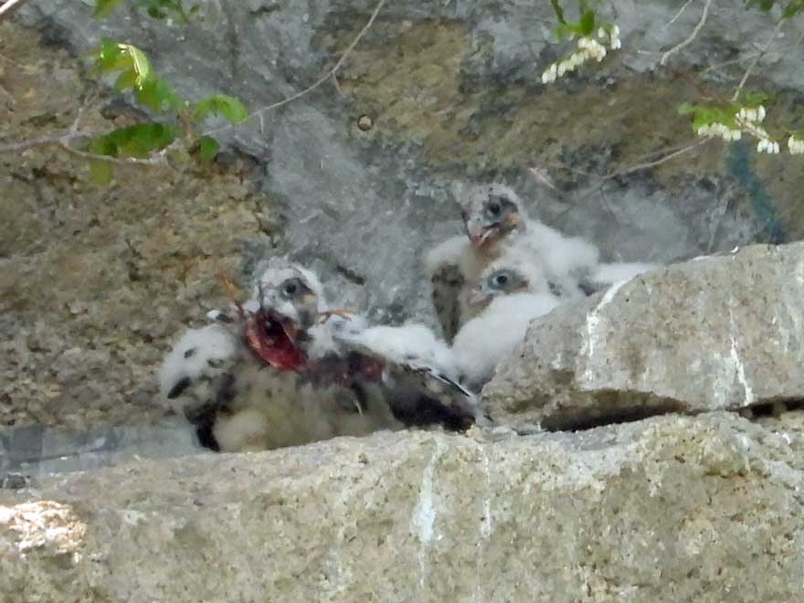 山地に入って、オオルリ、キビタキの声がよく聞こえた。今日最大目的のハヤブサのヒナは良く見ることができ、探鳥会資料写真の一週間前よりかなり大きくなっていた。河村さんからは2~3日前から雌親が来なくなったとお聞きしたが、写真のようにヒナはムクドリを食べており、雄親が頑張っていると思われる。