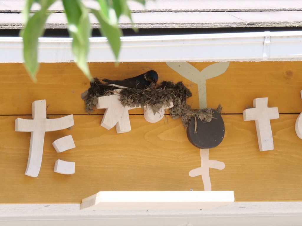 朝、 私市駅前に着いてすぐホトトギスの鳴き声が聞かれ、幸先よくスタートした。私市集落ではヒナがいるツバメの巣があり、3つの巣にヒナが育っていた。今日は高温予報が出ていたが、10時過ぎ「星の里いわふね前」道路の気温が31℃を表示していた。