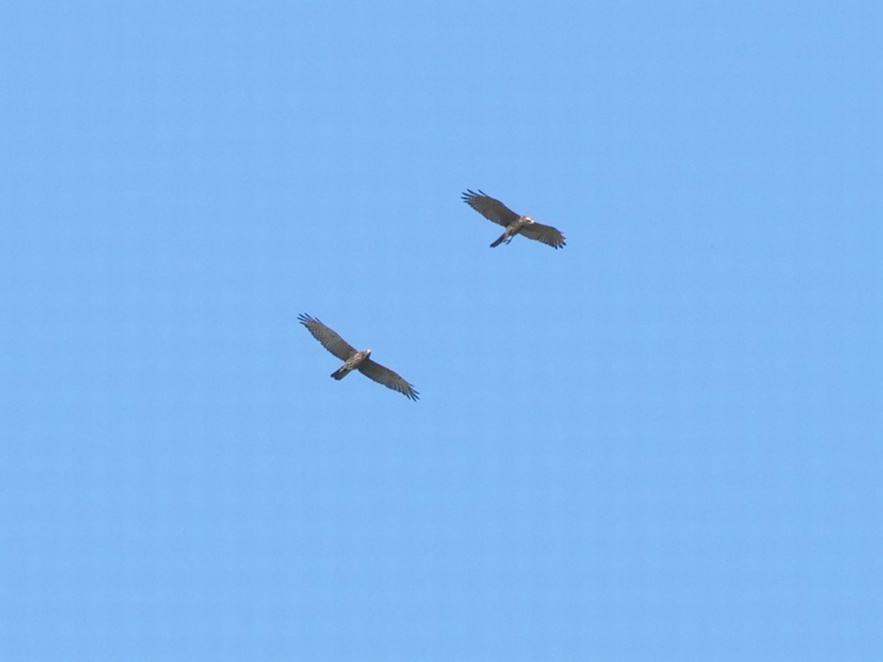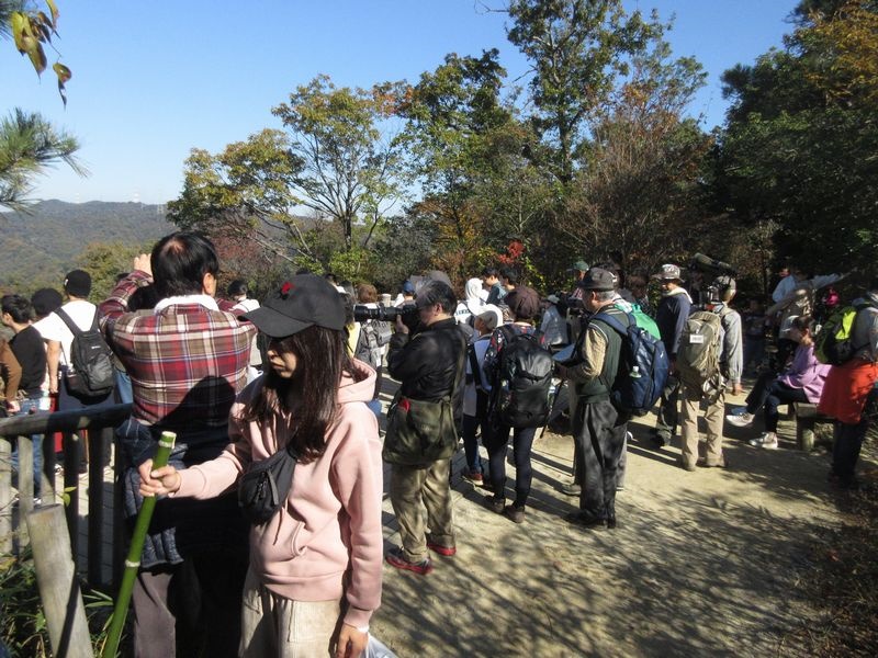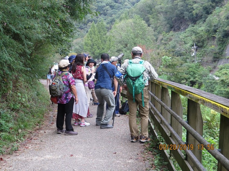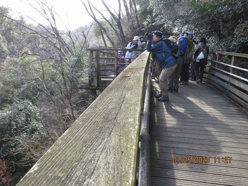 私市集落でイソヒヨドリやモズ、天野川ではカルガモ・コサギを見ることができたが、天野川沿いの樹林の遊歩道へ入るとなかなか鳥が出ませんでした。 ほしだ園地に入って、定住者のハヤブサがいなかったものの、ハチクマが1羽舞ってくれました。雨が降りそうな中、吊り橋「星のブランコ」を歩きたいとの希望があり、更に星のブランコ入口では展望台(標高230m)に行きたい人がいて、有志でフルコースを歩いた。