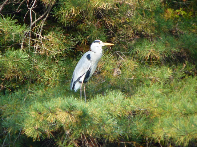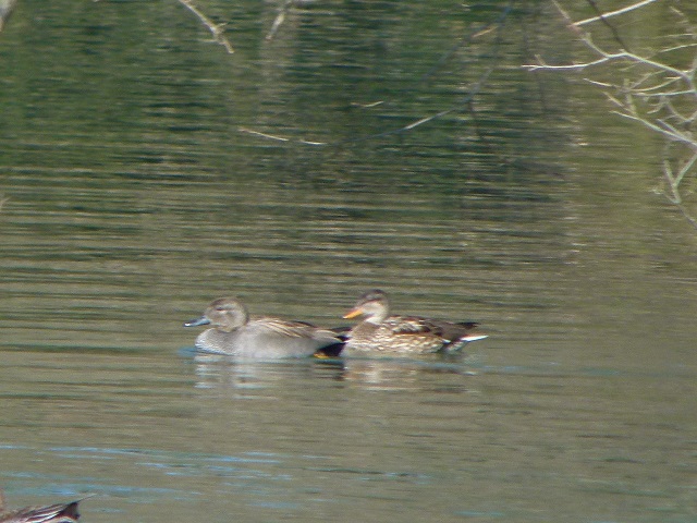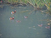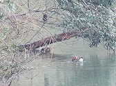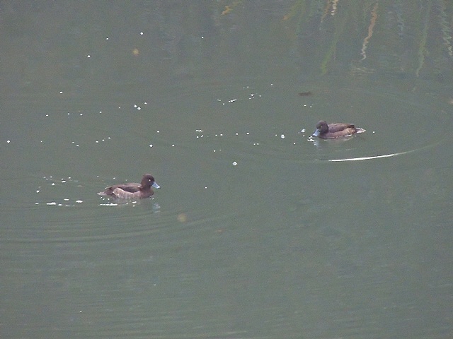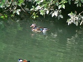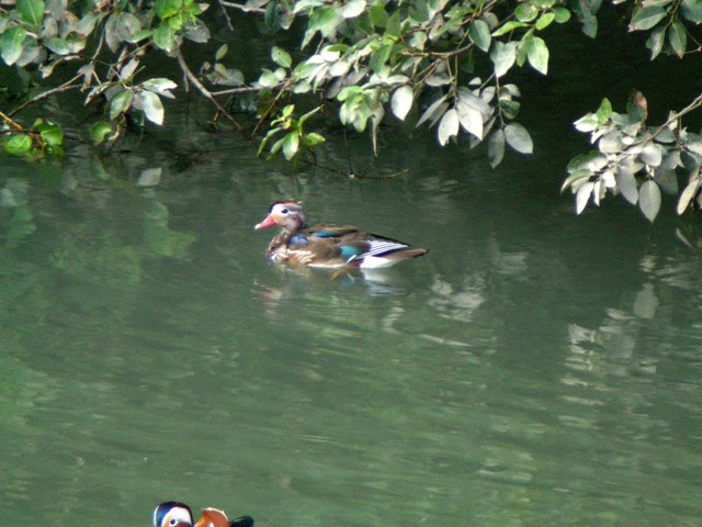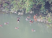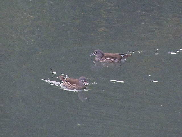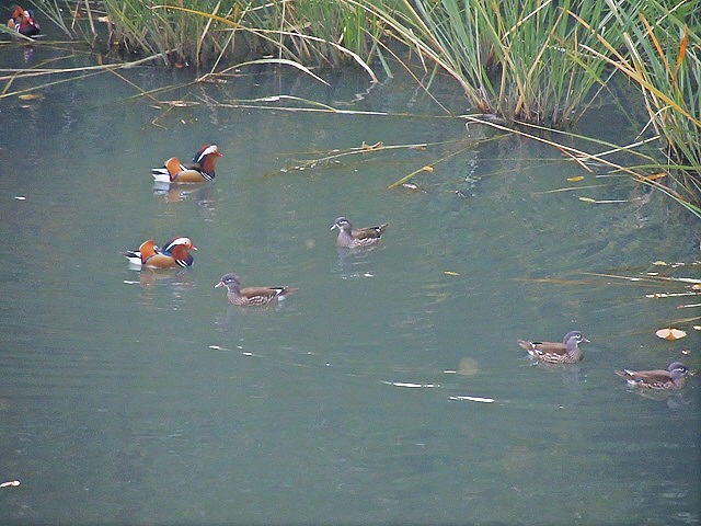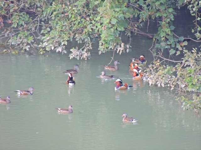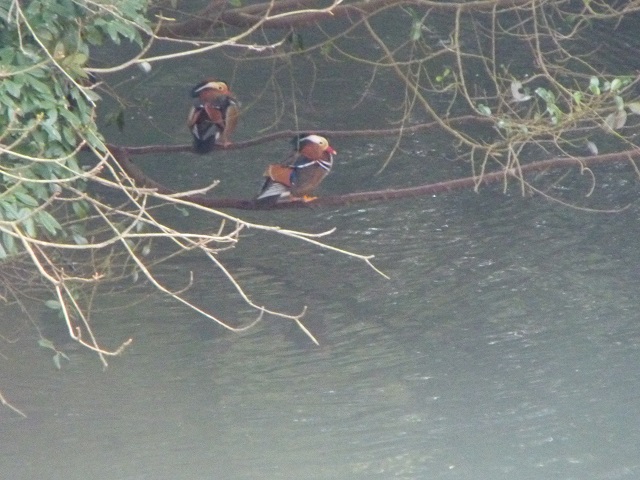 - まず細谷池でオシドリとカモの仲間を観察。残念ながら、オシドリが茂み深く隠れて姿をほとんど現さず。