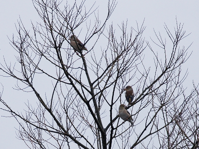 - エノキに群れるシメを観察。奥の池に珍しくオシドリが群れており、休憩もそこそこにじっくりと観察。