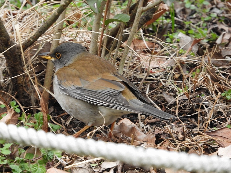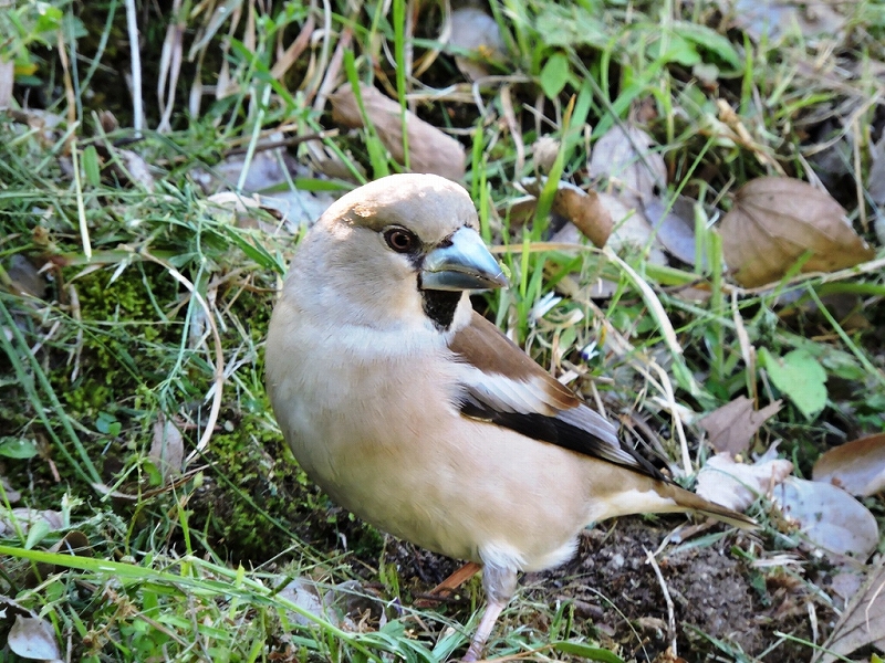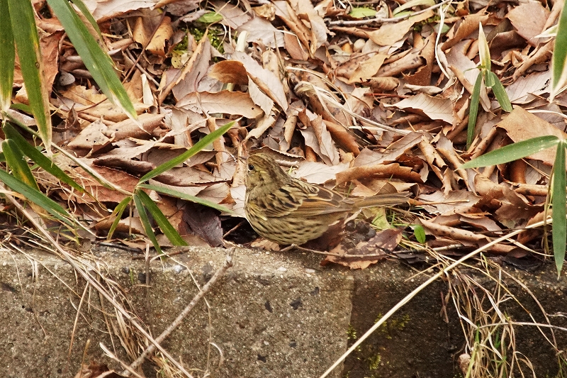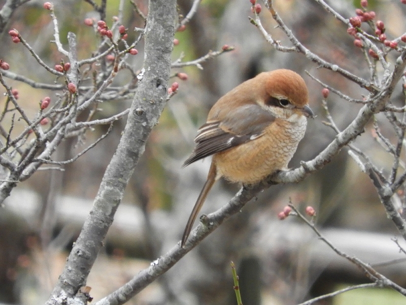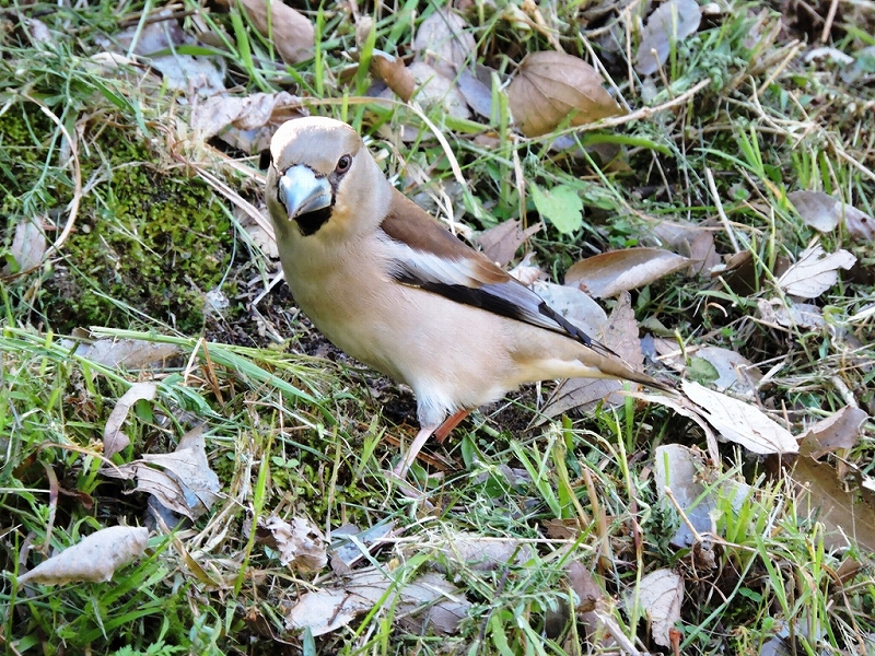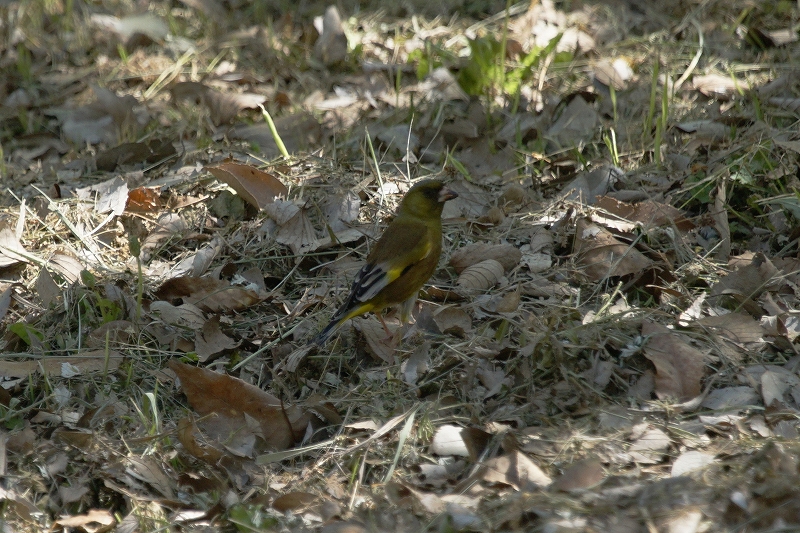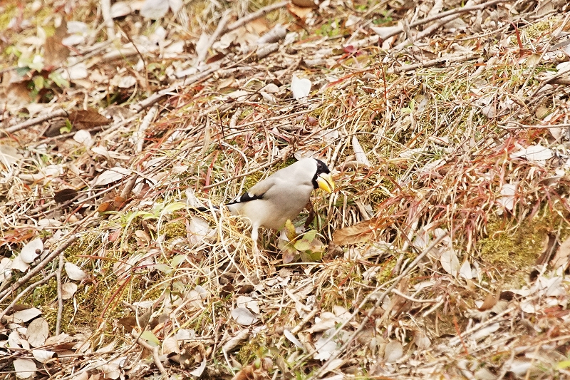 梅の里では、イカルの声が賑やか。尾根筋のクヌギ林をいくつかの群れに分かれて鳴きながら飛び、一部は、地面に降りて採餌しているところを観察。