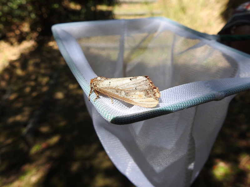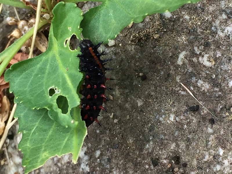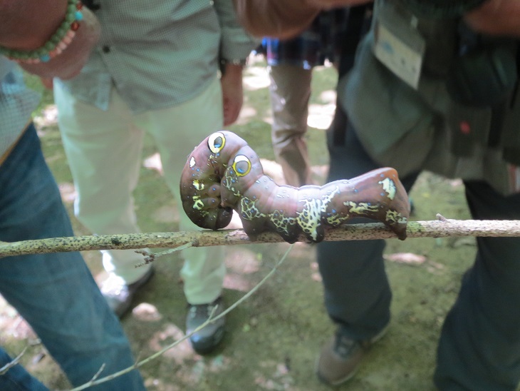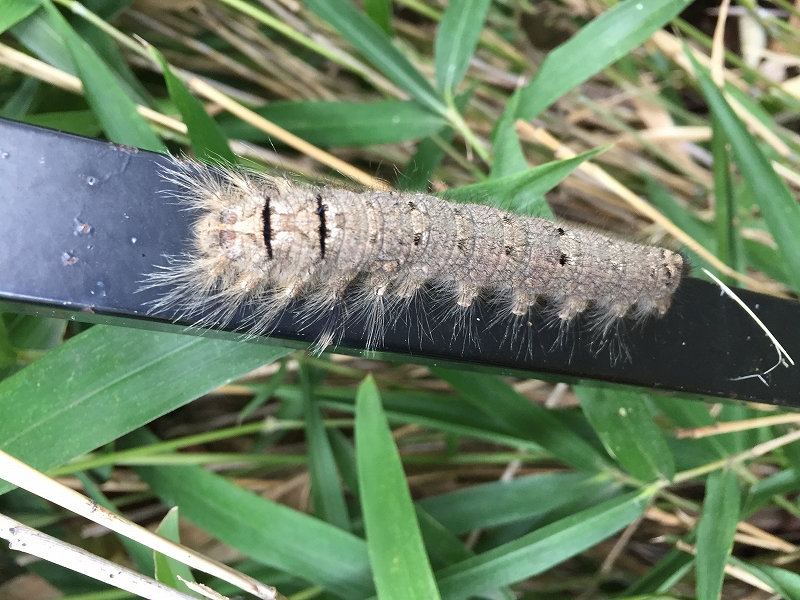 すぐ横のフェンスには、大きな二つの目玉模様が特徴のアケビコノハの終齢幼虫を発見。