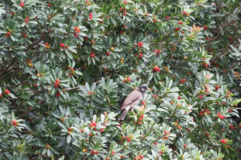 赤穂池の堤防上ではヤマモモの実にa? クドリの若鳥の群れが群がり、せっせとついばむ様子を観察。手の届く場所の実を私たちも賞味。梅の里では熟した梅の実も。