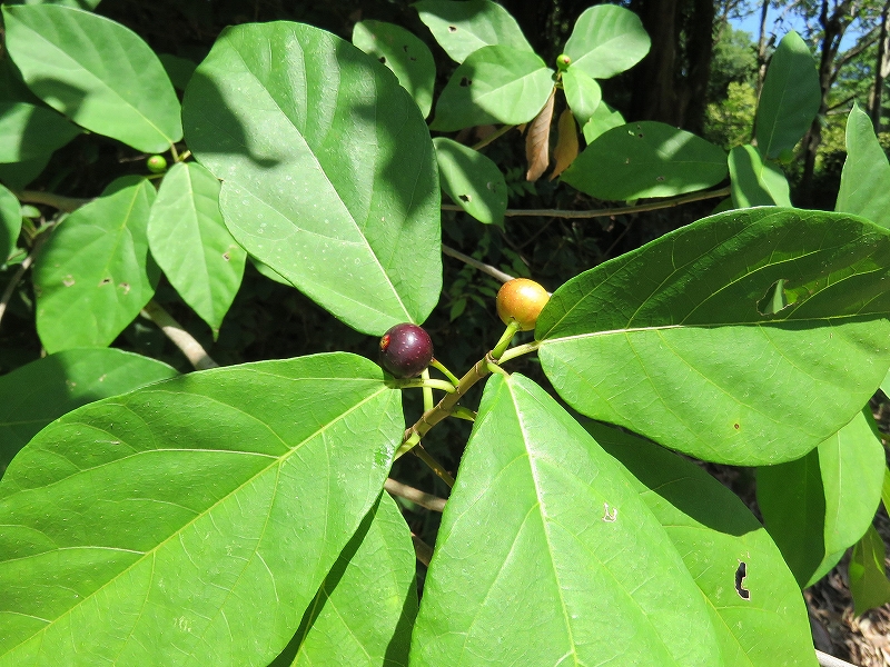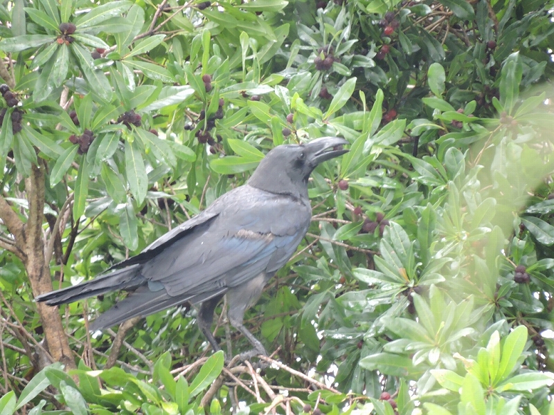 集合前、パークセンター前でハシブトガラスの親がヤマモモの実を幼鳥に与えるところを目撃。
