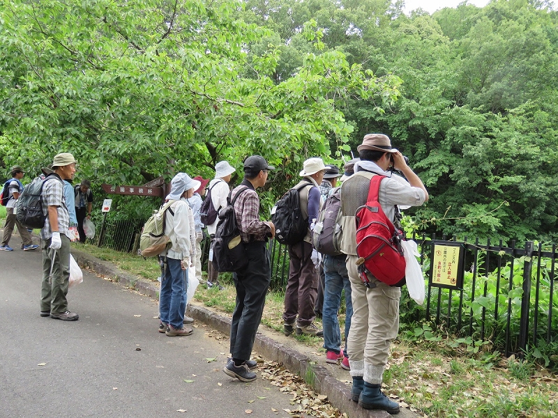 つつじが原の園路では、サンコウチョウの声。せせらぎの小径でも声のする方向に全員が双眼鏡を向けたものの、姿を確認できず。