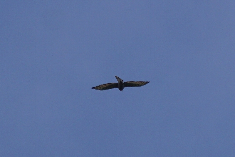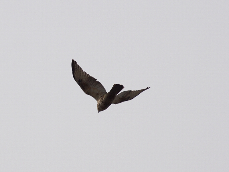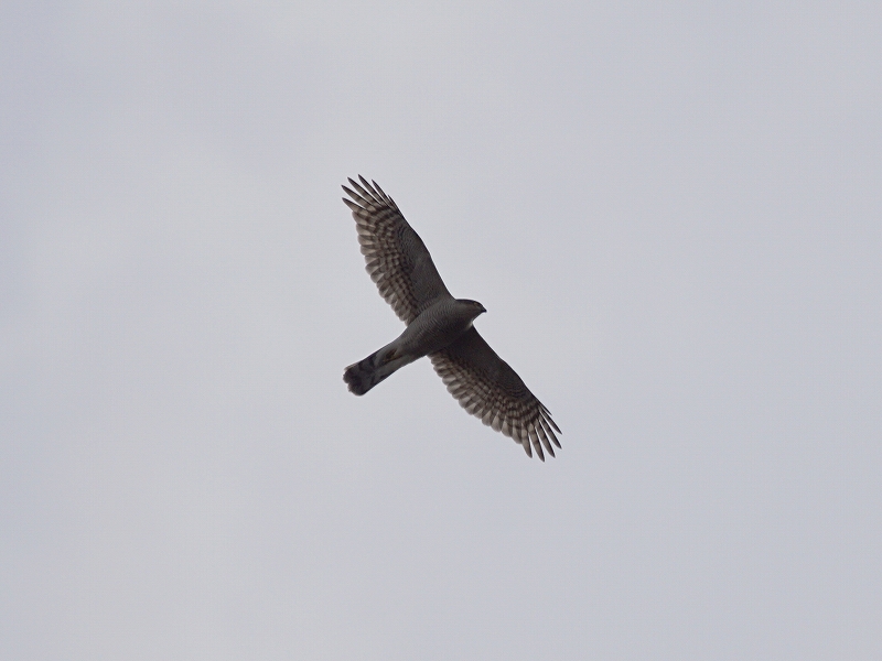 タカが遥か上空を通過するのを眺めているとすぐ近くにシジュウカラ・ヤマガラ・メジロの群れも現れたほか、モズの高鳴きの声。