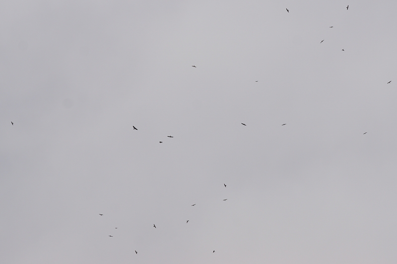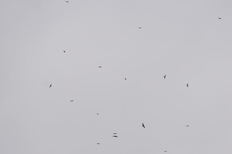西南西の方向に流れ、そこで上昇気流をつかまえてタカ柱を形成、旋回しながら高度を上げ、次々と西南西方向に飛び去るところを確認。