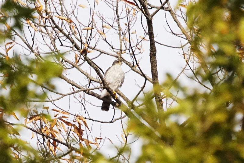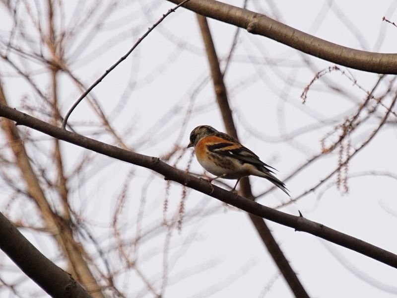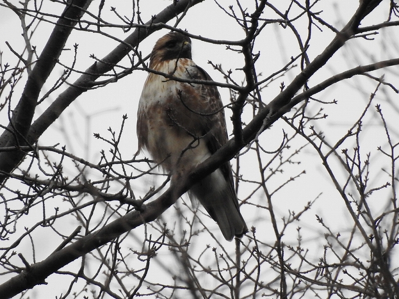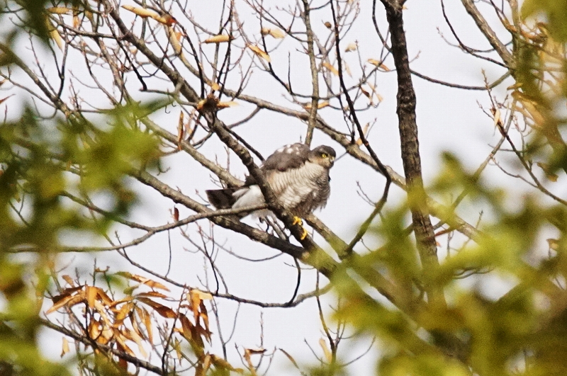 振り向くと公園内の葉が落ちた木にハイタカが止まっているところを発見、横向きに止まっており、腹のオレンジ色の縞模様がはっきりと見え、雄であることを確認。
