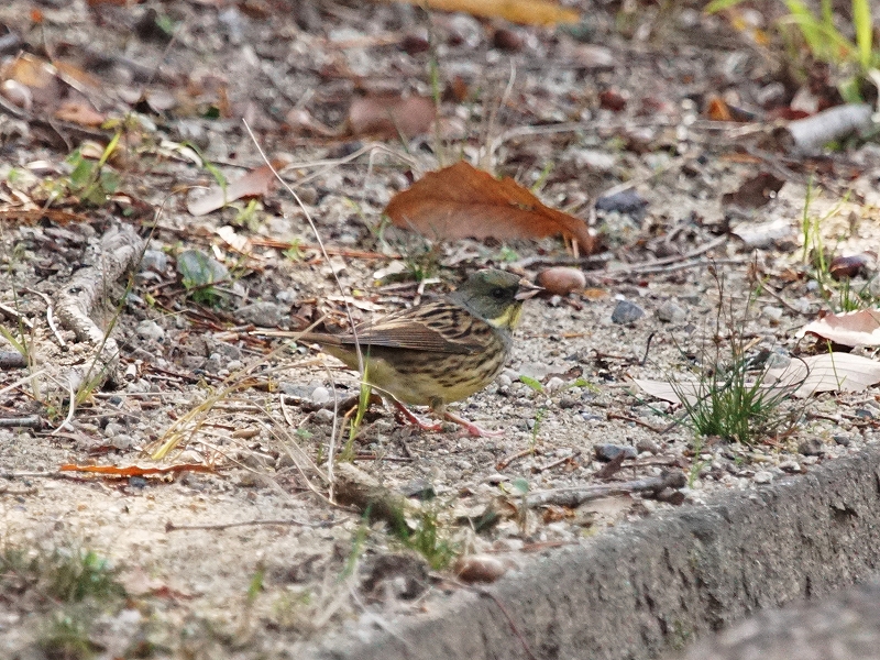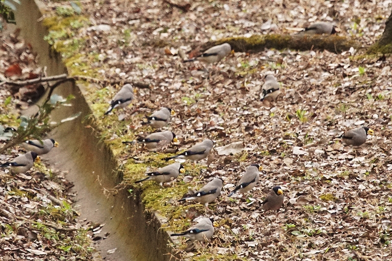 梅の里では、40羽を超えるイカルの群れ。ほかにも、中央園路、河内の里など、行く先々でイカルの群れが地上で採餌するようす、水を飲んでいるようすなどを確認。