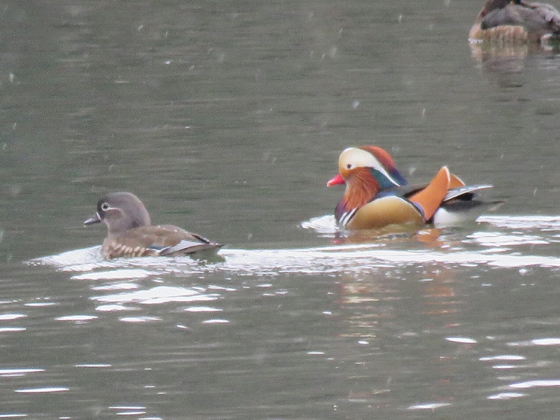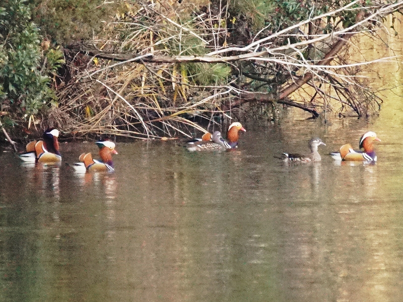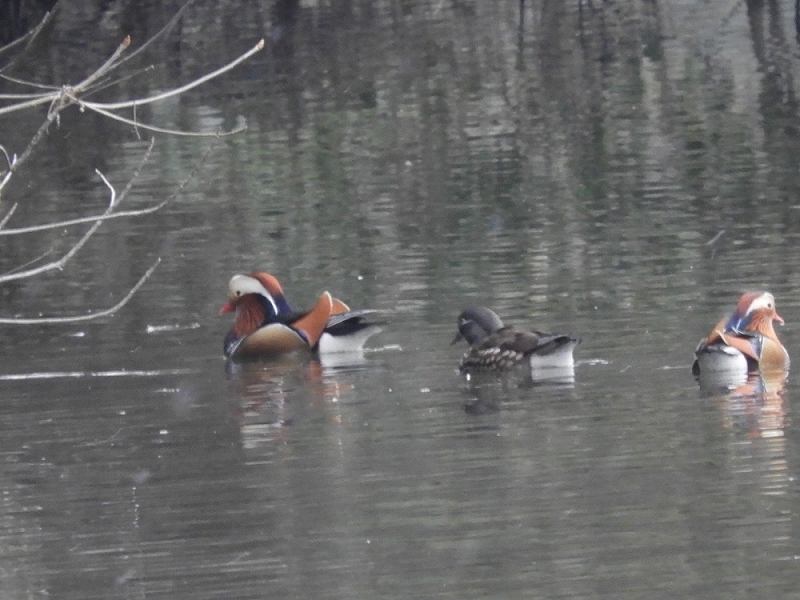 数は少ないものの、ヨシガモ・オカヨシガモ・ヒドリガモ・アメリカヒドリ・ホシハジロ・キンクロハジロを観察。最後に一部の参加者がオシドリを確認。この時期にカモのなかまを7種類も確認したことは、珍しい。
