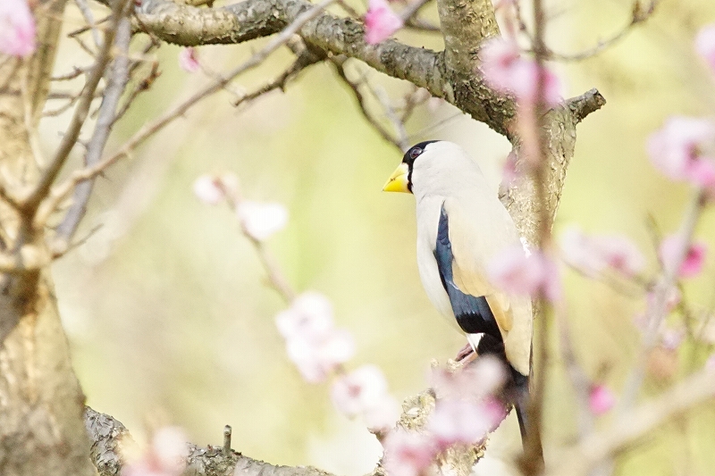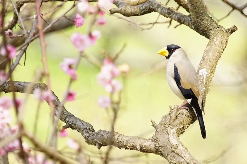 梅の里のエノキには、40羽を超えるイカルが集結。しきりに実を食べるようすをじっくりと観察。ニセアカシアの木にも集まり、豆果の鞘をくちばしで器用に外し、中の実を食べるところを確認。