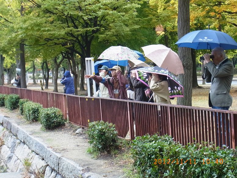 - 本部柳生博会長から「自然界にいる鳥が怪我した場合や、コウノトリ・トキを自然界に復帰させるプロジェクトにおいて、獣医さんの協力を得ている」と主催者獣医師会にお礼の挨拶を述べられた後、柳生会長と一緒に歩く探鳥会をスタートした。