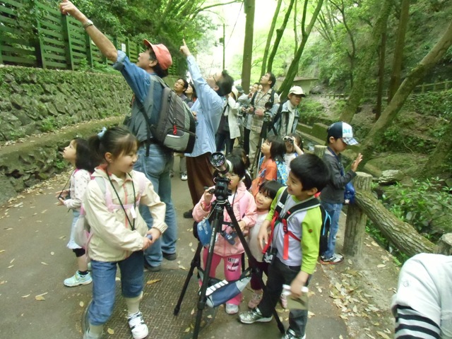 - 滝道から山道に入り、鳥影は少ないものの、メジロ・ヤマガラ・センダイムシクイ・ヤブサメ・サンショウクイ・オオルリなどの声を聴いていただきました。参加者の中には視力に障害のある方もいらっしゃったので、とりあえずホッとしました。