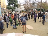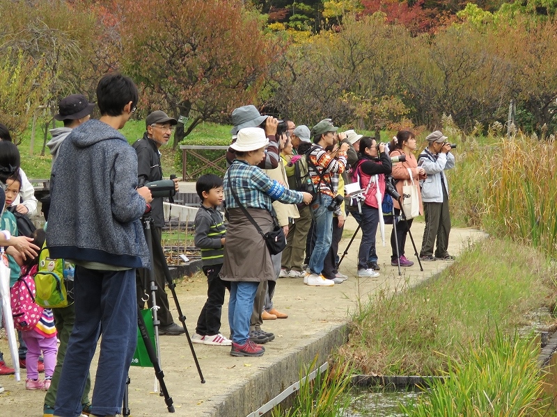 - 生憎の曇り空のなか81名の参加者があり、10名前後にリーダー1〜2名のグループ編成で順にスタート。リーダー初心者も出来るだけ皆さんに楽しんでもらえるよう一生懸命鳥を探し熱心に説明した。カモは年々少なくなってきている感じがするが、例年一番人気のカワセミも登場し30種を確認。皆さん、満足げな笑顔で終了した。