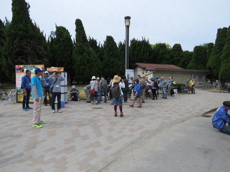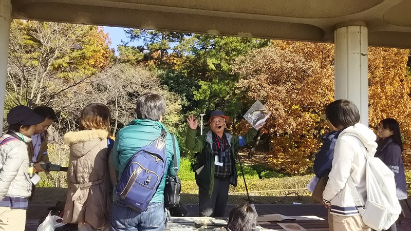 今回は5班に分かれてうずわ池、新宮池、やまが池の3つの池を中心に公園内を回り、最後に円形花壇の休憩所で鳥合わせを行った。鳥合わせも各班ごとに分かれて行ったが、各班夫々に趣向をこらして鳥の説明を行い、参加者の皆さんも熱心に聞いておられた。