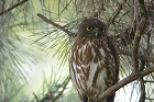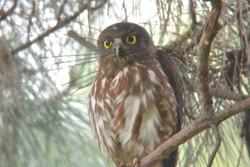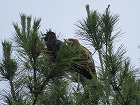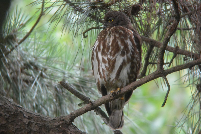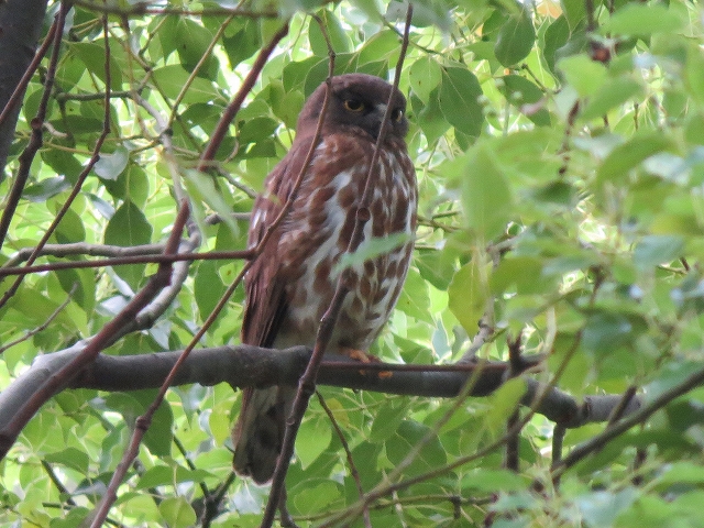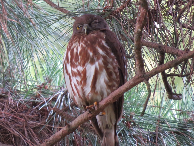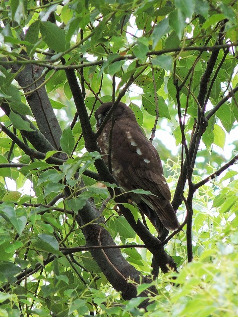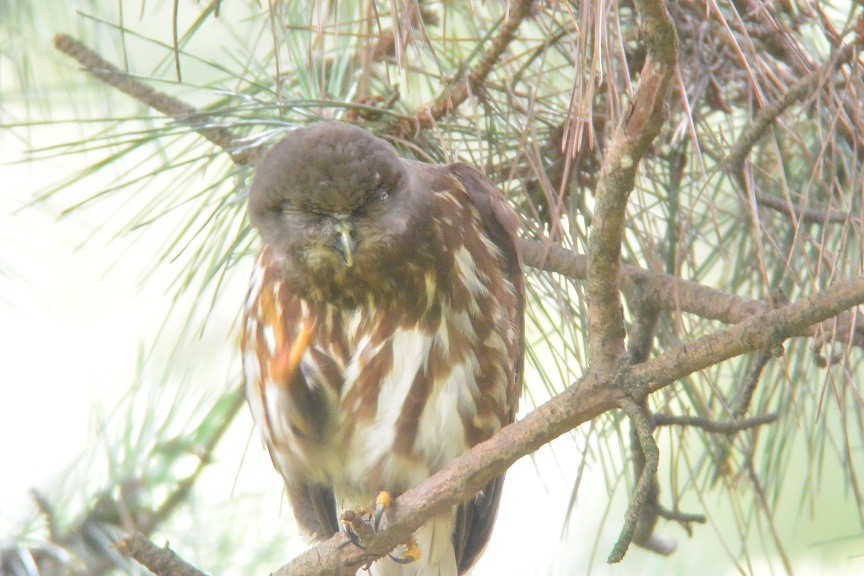 - お目当てのアオバズクは、3箇所の営巣場所のうち、バードバス近くの巣箱の北側のクヌギに2羽、近衛邸跡のクロマツの大木に1羽の親鳥が止まっているところをじっくりと観察することができました。