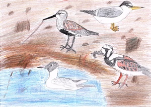 - 二番目にうれしかったのは、夏羽になったユリカモメのむれです。中には、まだ冬羽のこもいてたけど、大空をすごい大きなむれでくるくると回っていました。それから、ていぼうの上にもずらーっと!!数えると145羽くらい!!