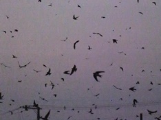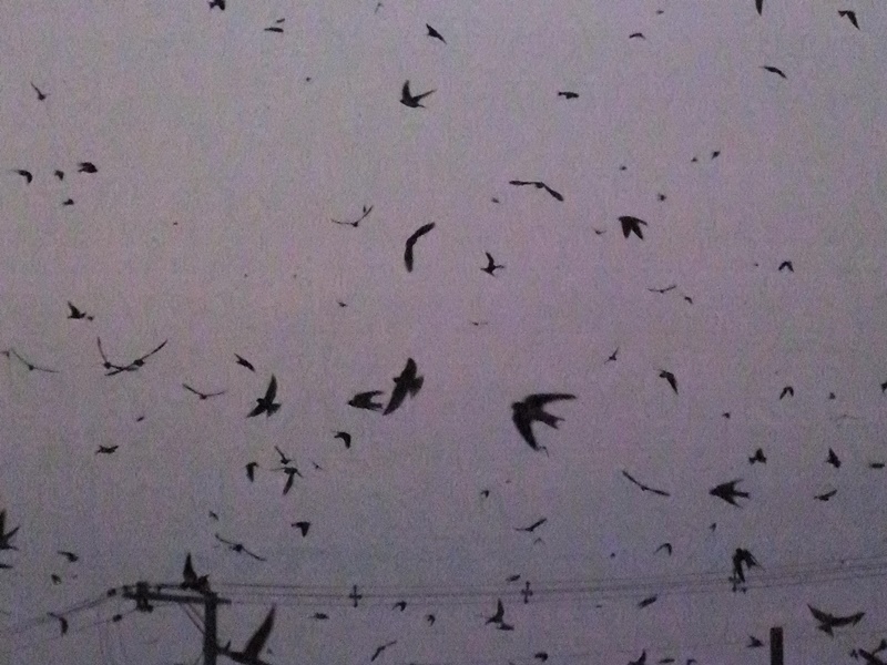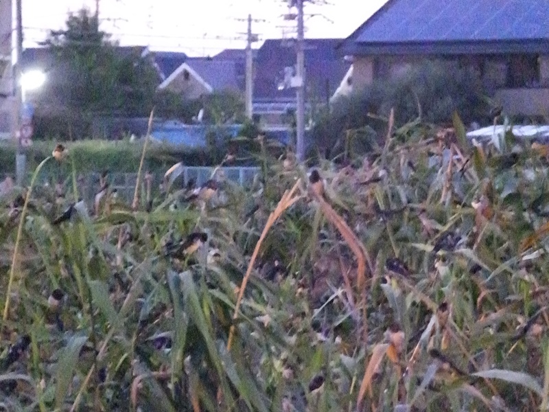 - それから夕食を食べ。、ツバメのねぐら入りを見にヨシ原に戻りました。するとさっきまで3〜4羽しかいなかったツバメの数がいっぺんにふえ、上空をとびまわっていました。そして日がくれ始めるとヨシ原にツバメがおりてきます。しかしヨシが気に入らないツバメがいるらしく、一度ヨシにとまってもまたすぐべつのヨシに行っていました。