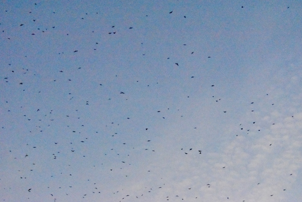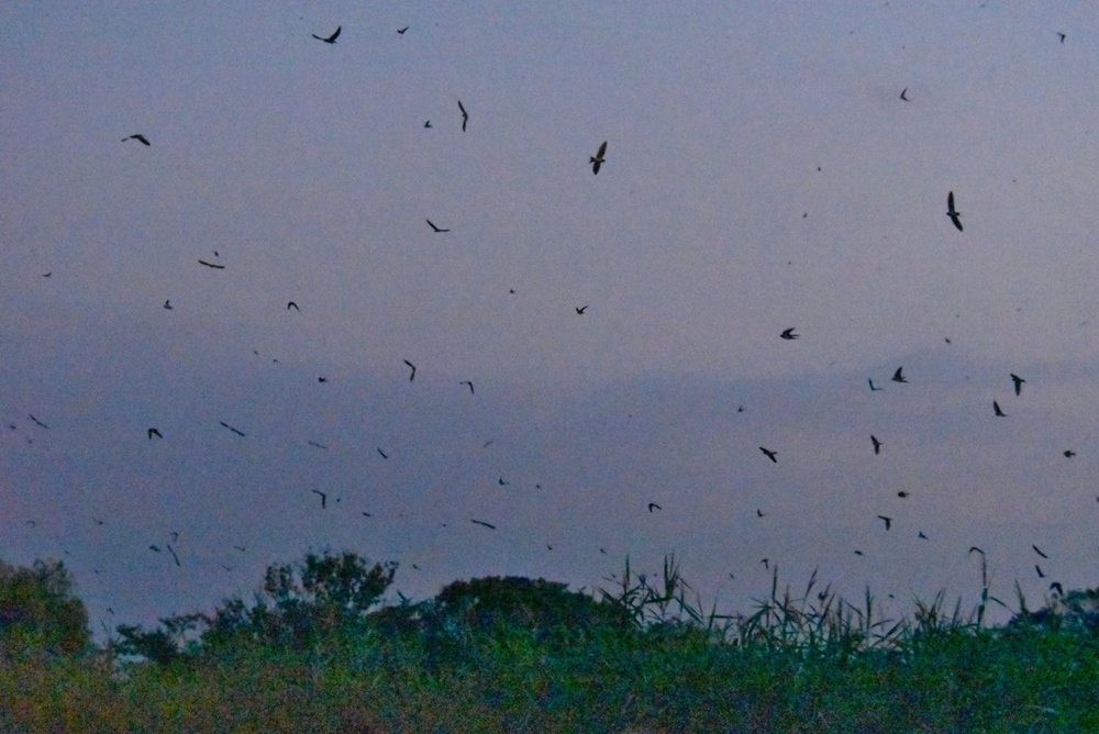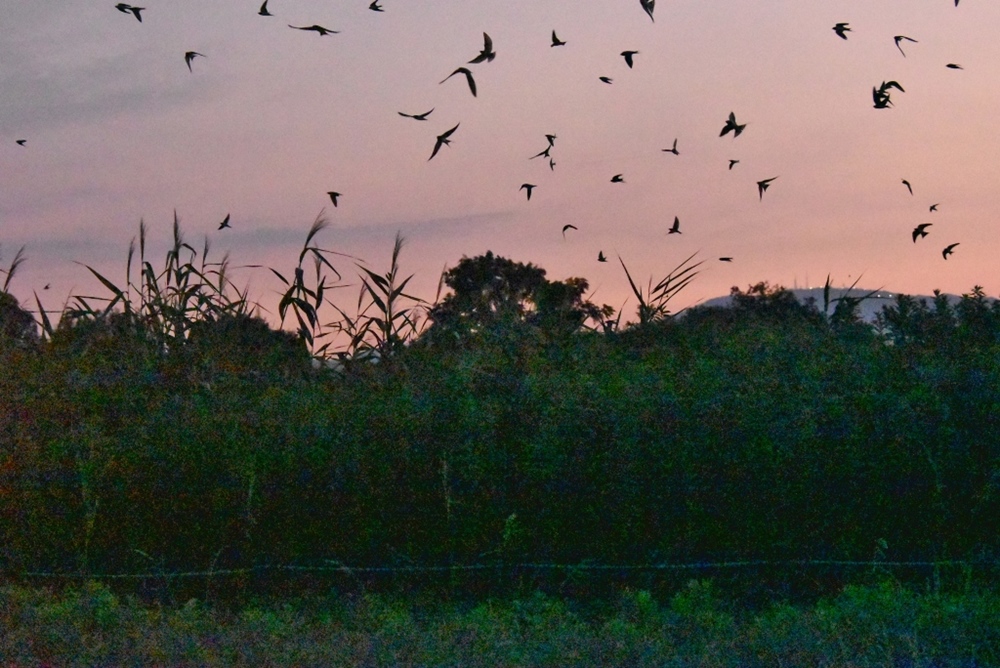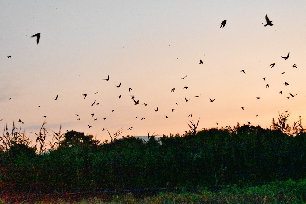 初めて見たツバメのねぐら入りは、「こんなにたくさん、大群になって空に集まるんや。」とびっくりしました。ねぐらに帰ろうと急降下してくるところは、まるで雨がふっているみたいでした。