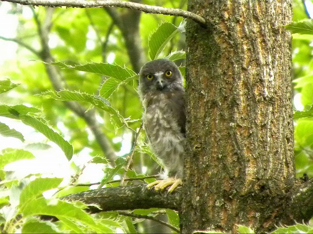 この時期、運がよければ、夕方から夜にかけて、ホウホウという鳴き声を聞くことができます。また、7月中旬以降は、2羽の親と数羽のヒナと仲良く肩を並べている姿を見ることもできます。