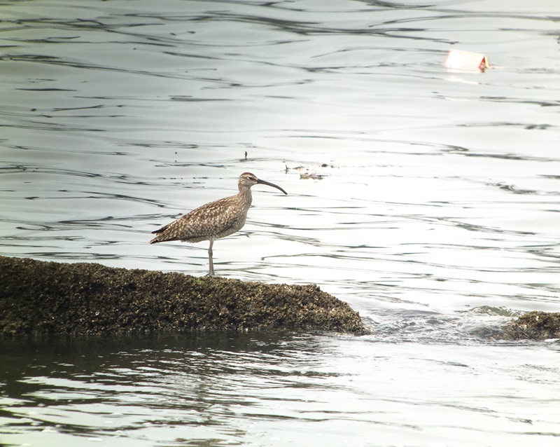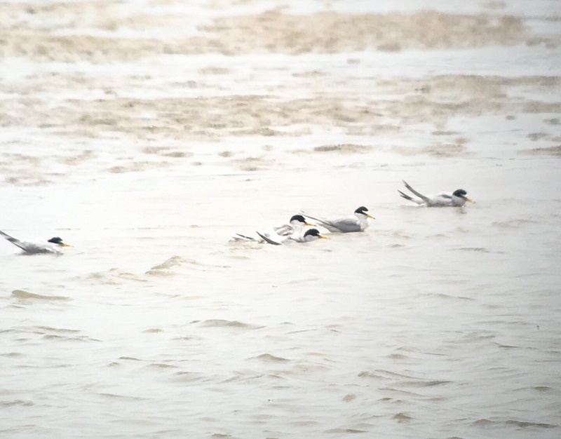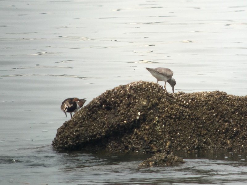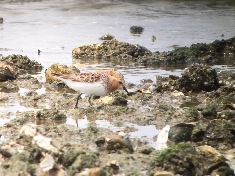 駅から甲子園浜まで歩き、探鳥会はスタートしました。浜では、キョウジョシギやキアシシギは数多くいましたが、夏羽のトウネンやメダイチドリは各一羽だけでした。チュウシャクシギがカニを食べた所やコアジサシの水浴びやダイビング場面も楽しめました。最高気温28℃の暑い一日でした。
