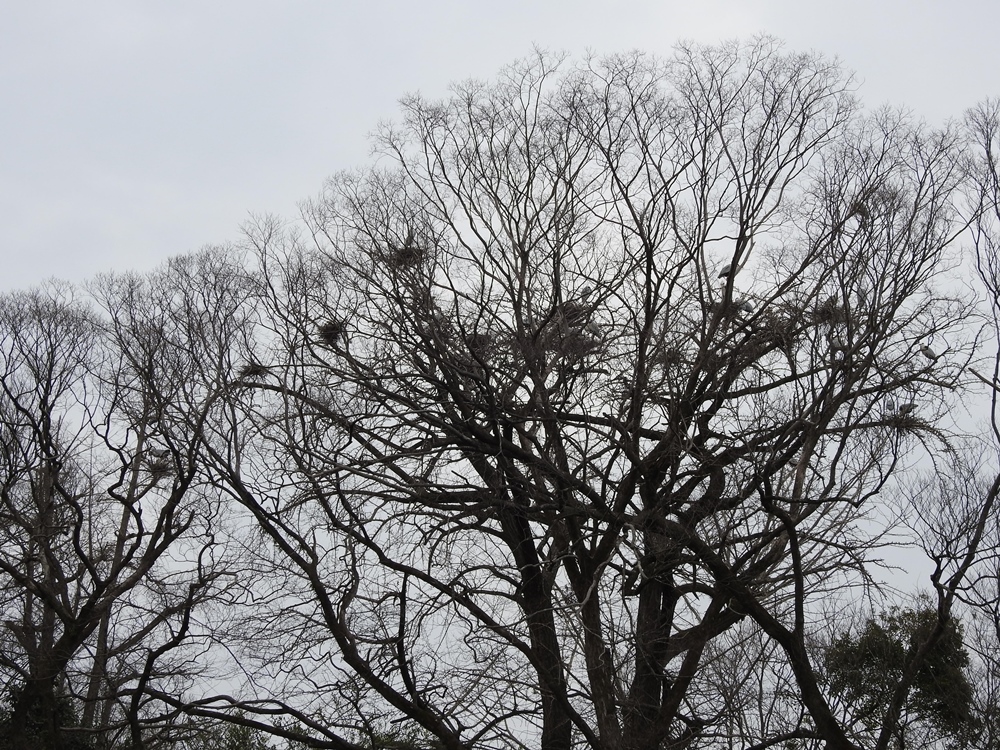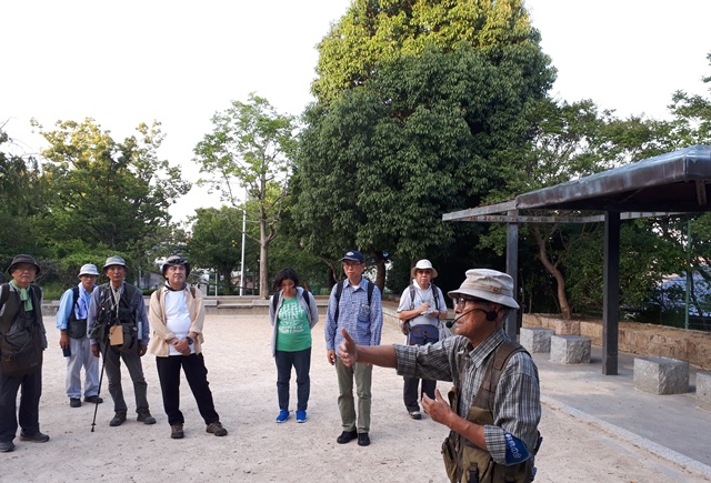 曇り空のもと、探鳥会をスタート。九条池でアオサギのたくさんのコロニーを観察し、堺町御門近くでは、20羽ほどのアオバトに出会えました。