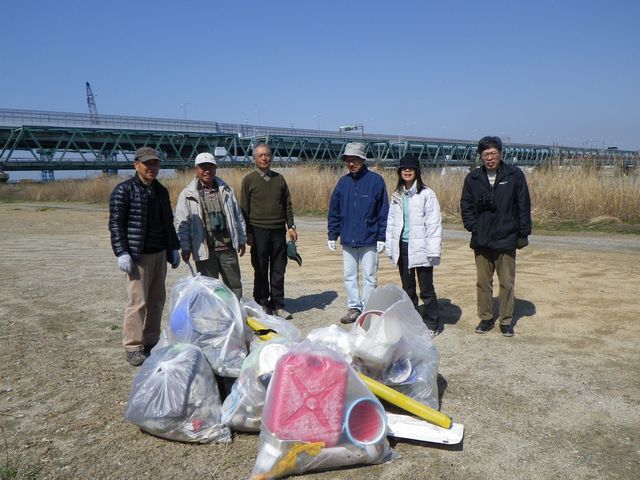 この欄の写真はクリックすると拡大して見ることができます。- 野鳥観察は8時30分に集合した。参加者は13名 観察した野鳥28種、10時よりゴミンゴの若い皆さんに合流しゴミ拾い。
